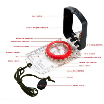 Outros detalhes como marcadores luminosos, pés de silicone, dobradiças de metal, capa plástica, cordão para fixação no pescoço e bolsinha de armazenamento e transporte são os diferencias dessa bússola.