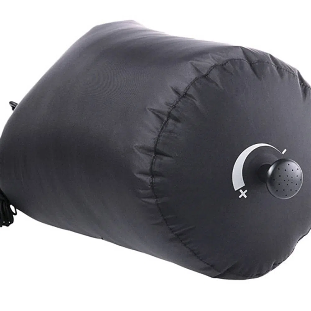 Feito com material muito resistente e impermeável, é possível regular o fluxo de água girando o sistema de rosca que libera a água. Possui fechamento semelhante aos sacos estanques, ou seja, basta encher o chuveiro com água, enrolar a parte superior e suspendê-lo!