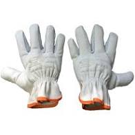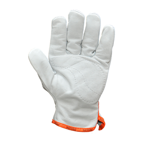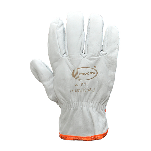 Luva de segurança confeccionada em vaqueta, reforço interno na palma, reforço externo de costura nos dedos polegar, médio e anular com elástico no dorso para ajuste.